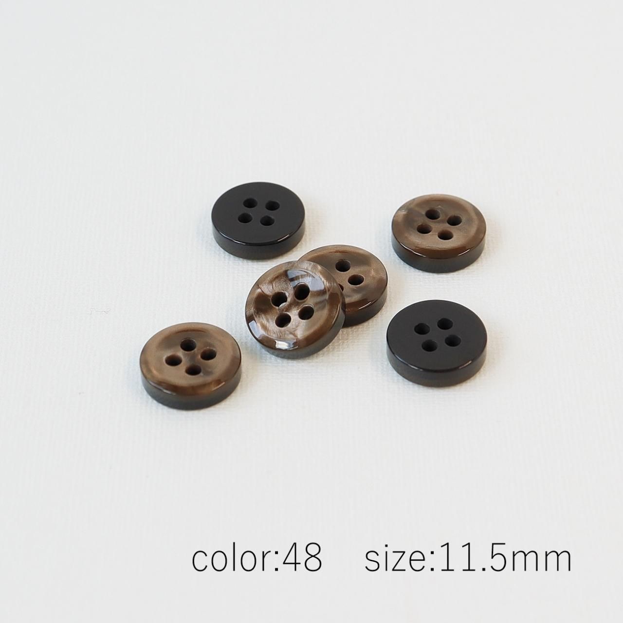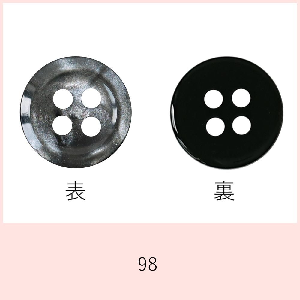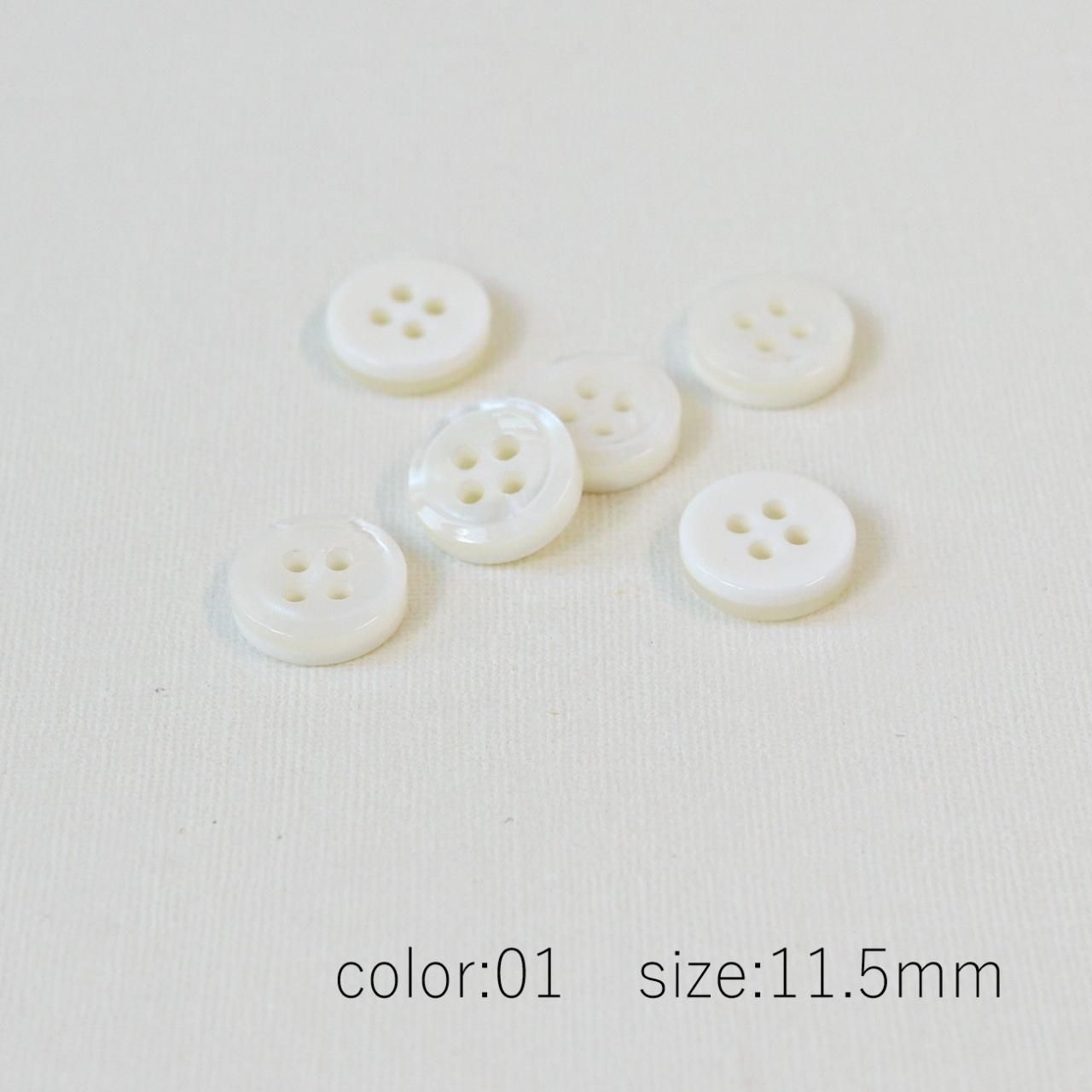 フチまわりの角を取ったような型をしたツヤ仕上げの4つ穴ボタンです。