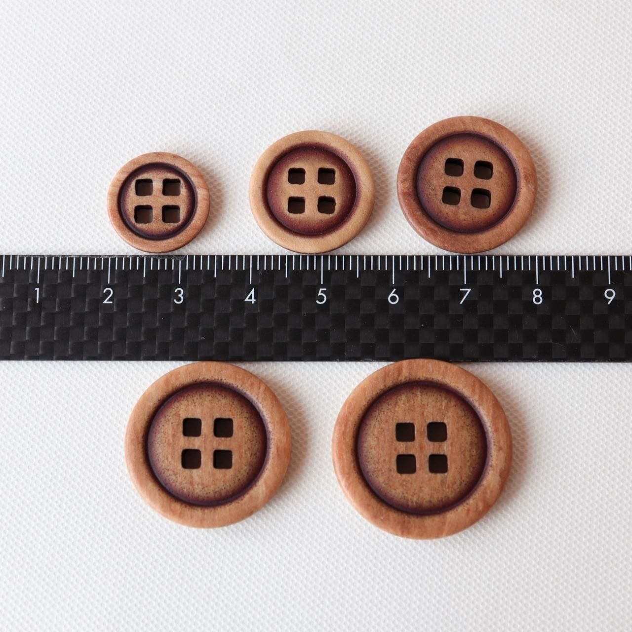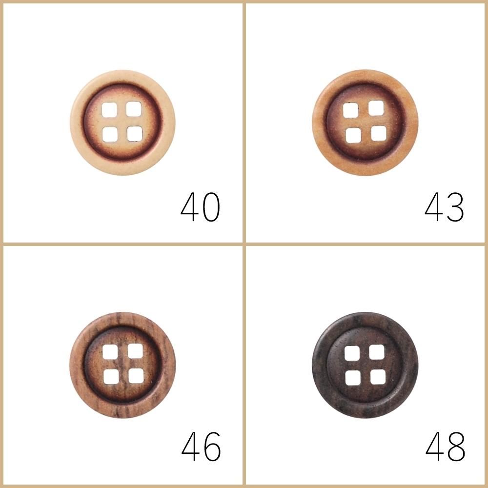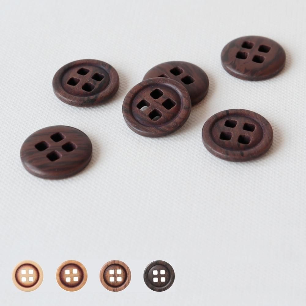 カタチはフラット気味なフチありで、ホールが四角穴になった4つ穴ボタンです。