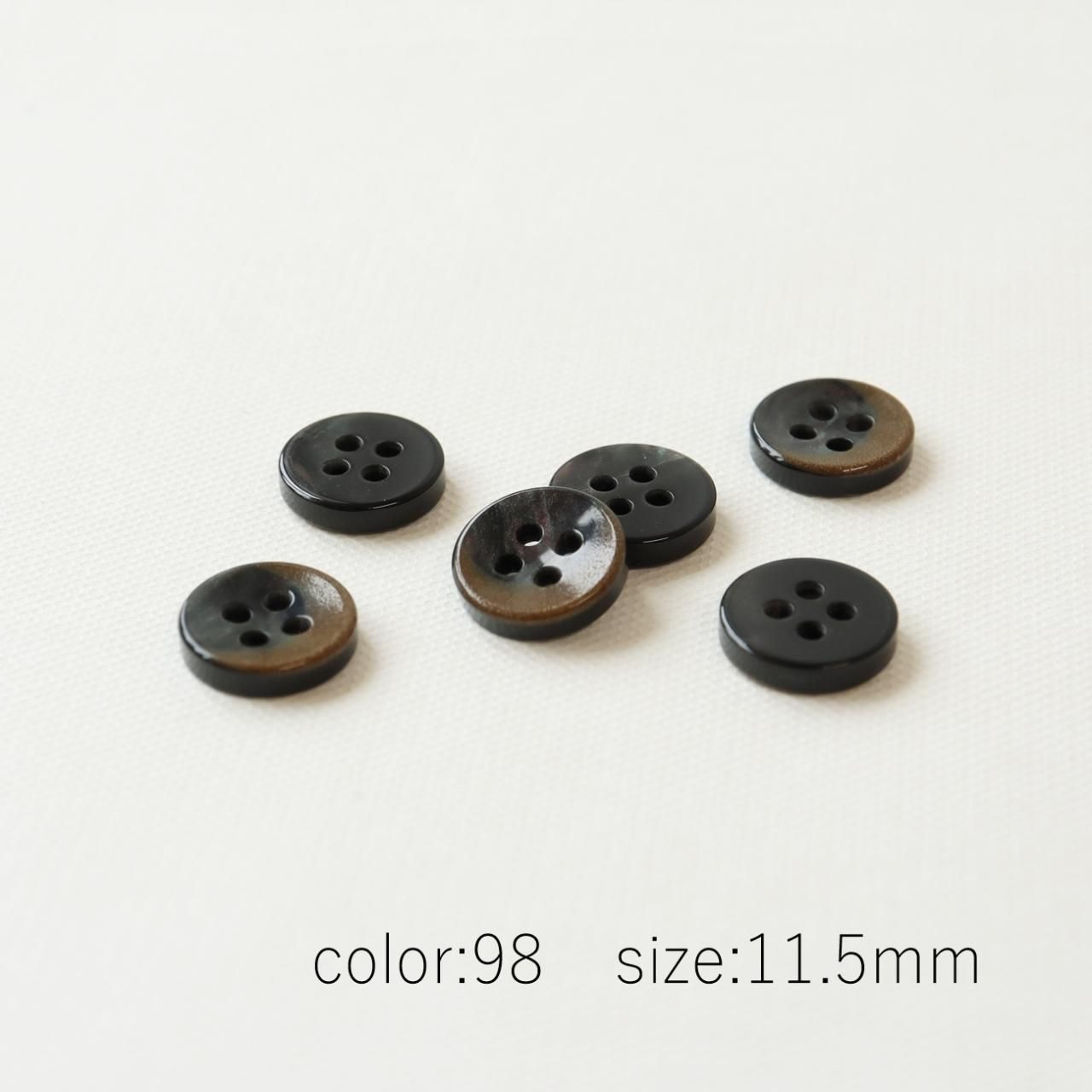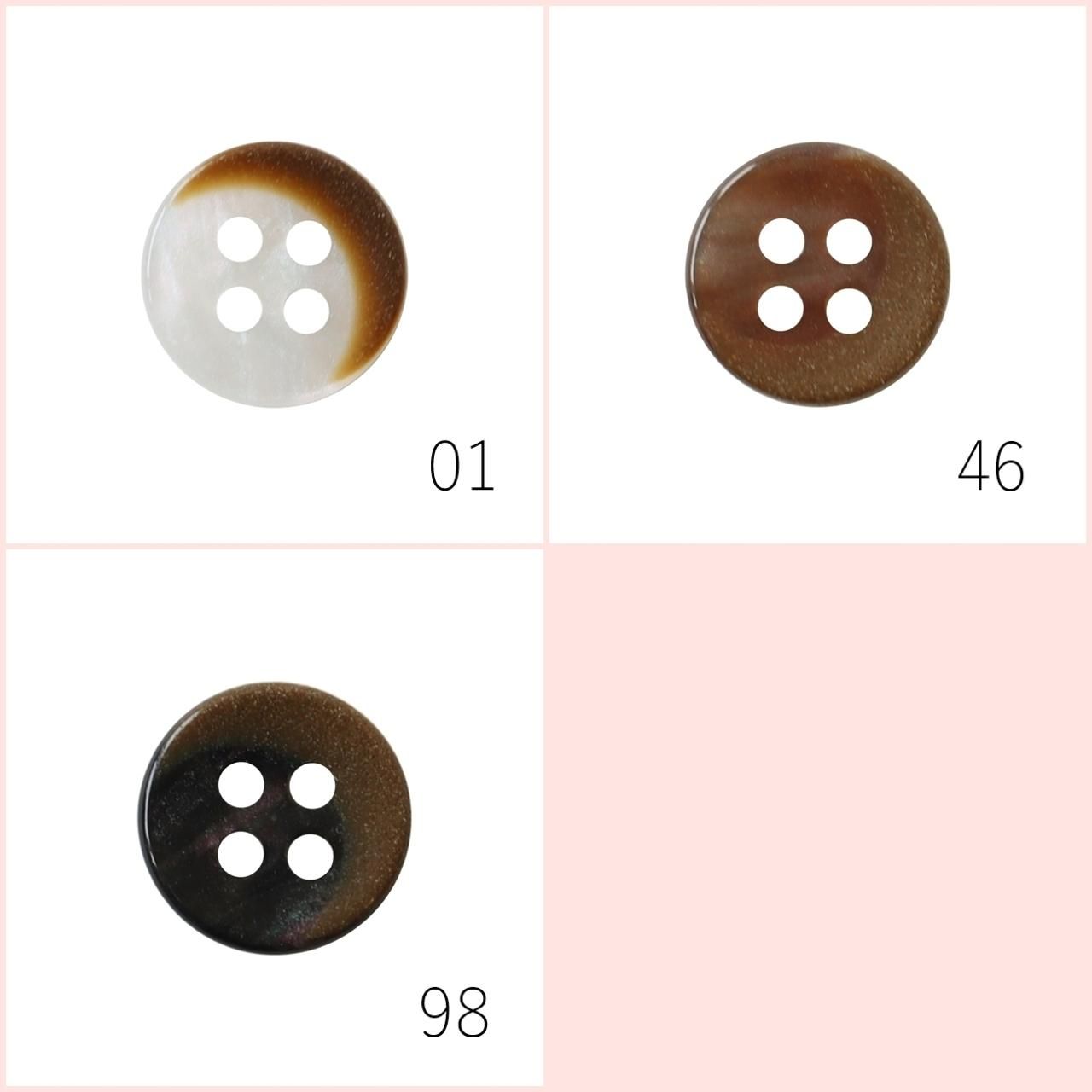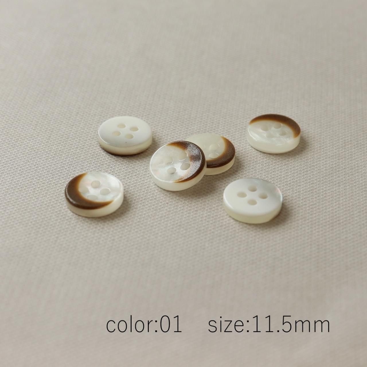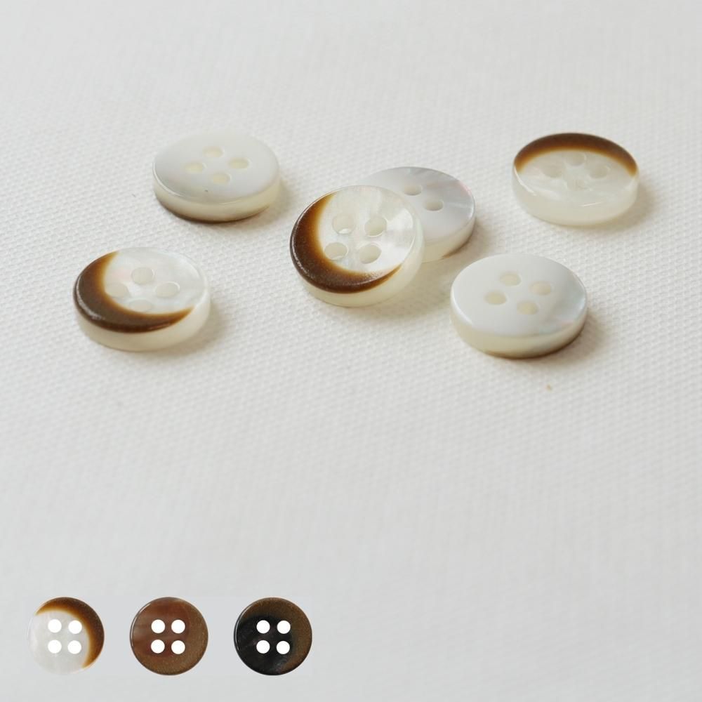 皿型の貝調ボタンのフチ半分くらいに焼き目を入れたような風合いを模した
